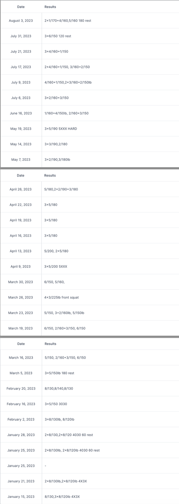 If you are like me, you are in this position not only because you jumped a lot, but because you did so while being weak. Rehab exposes your weakness. I began to find 4 sets of 8 reps doing 3 seconds down, 3 seconds up with 100lb on one leg taxing. That had to change. Here is my training log from the end of August till January 11 2023 (read it from the bottom up):